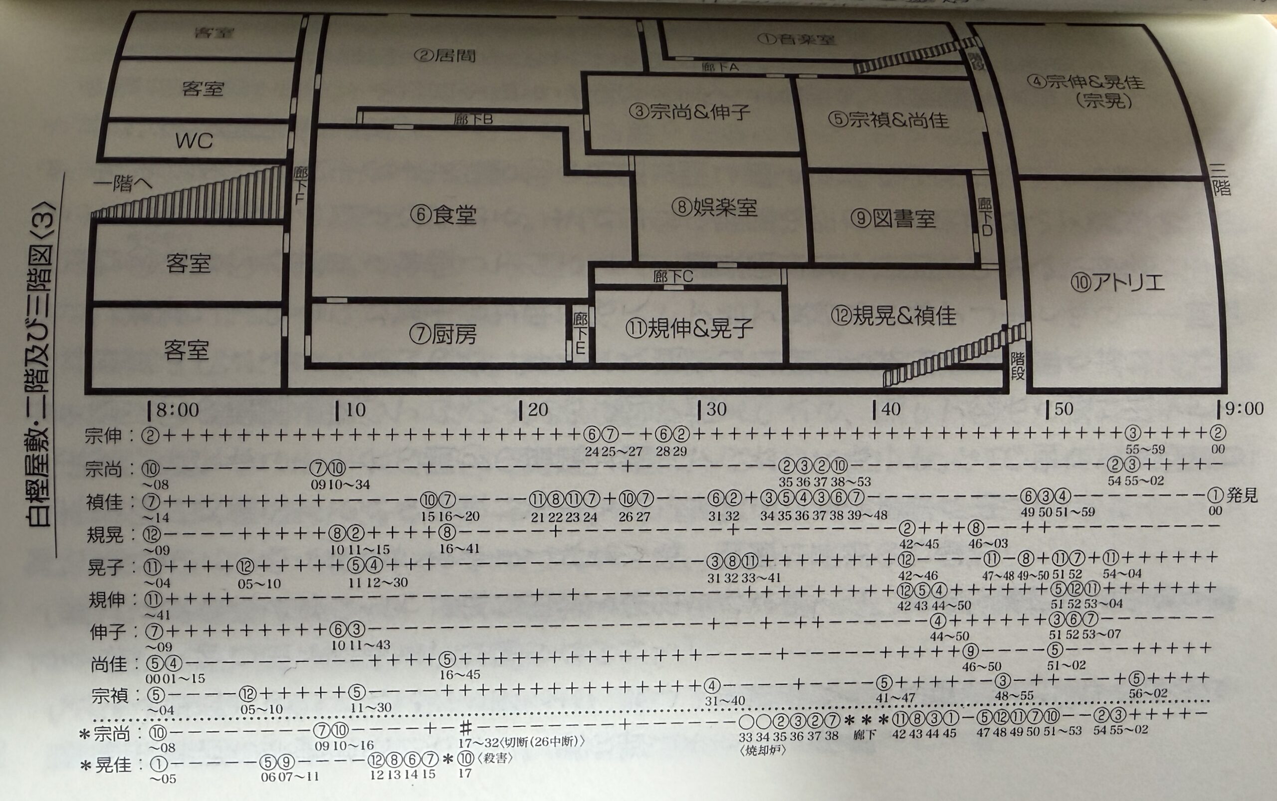 白樫家にはいたるところに時計が設置されていて、一日の行動が分単位で管理されている。誰が、何時何分に、どの部屋で、誰といたか。